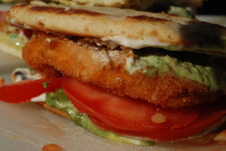 Spread the mayo and chutney mix on each pita bread. Cut the pita and chicken patties in half. On one half of the pita, place a layer of tomatoes, 2 half patties, then top it with another half pita, cut it in the middle and serve.