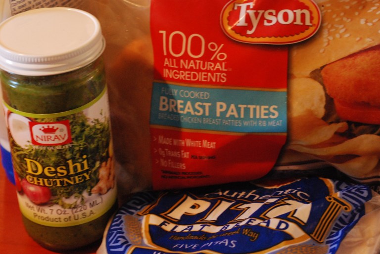 I purchased the cooked chicken breast at Wal-mart, but I’m sure it’s available at any grocery store in the frozen food section. The Deshi chutney can be found in the Asian section by the Indian food, I got mine at a mediterranean grocery store. There are several kinds of chutney, this is the green one (Coriander). Hot is good, it gives a bit of a kick. Pita you can get at the bread or frozen food section as well.
