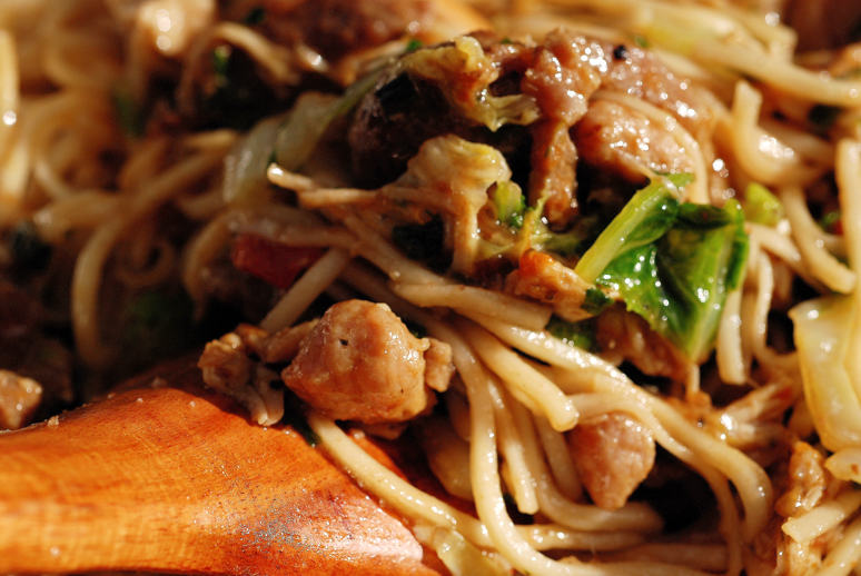 f you don’t have cooked meat, you can stir fry some chicken pieces. I’ve used de-boned and skinned thighs and used 4 to 5 thawed and fully defrosted thighs. Slice it in stir fry size (1/2 x 1/2 X 1 inch). Heat 1 tbsp. sesame oil on high. Sauté 3 cloves (crushed) of garlic. 3 chives chopped (in 1/4 inch pieces) with the chicken for 3-5 minutes or until meat is cooked and browned. Flavor with 2 tbsp oyster sauce. Then mix in 3 bunches of bokchoy or one small Chinese cabbage (Cut in 1 inch strips) and stir for a minute. You can use any meat and add more vegetables. This recipe is very forgiving. While sautéing the meat and vegetables, slowly add the noodles in until all are in the wok or pan. Add Maggi as needed, scoop some up in a bowl and enjoy!