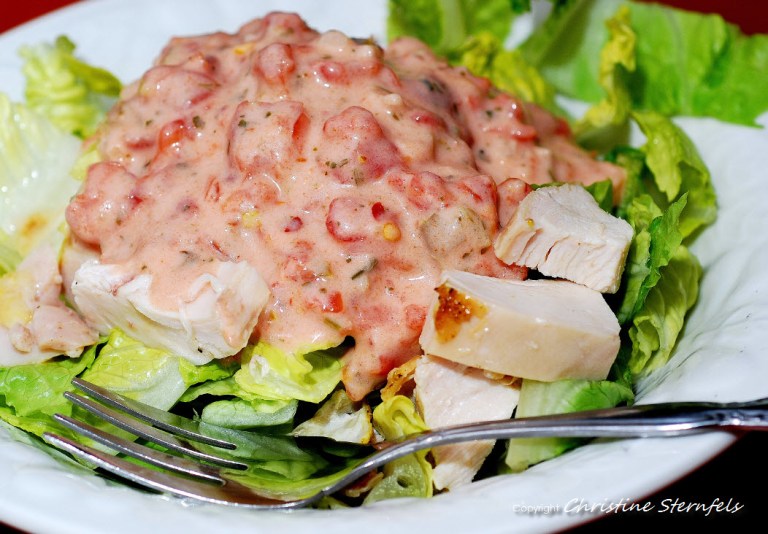 Ingredients: 2 cups Chicken strips (1/2 X 2 inch – Baked, grilled, fried or roasted chicken breast), 1 cup chopped tomatoes, 1 cup chopped yellow onion, 1/2 cup chopped cilantro, 1 lime, 1 romaine lettuce, 2 cups crushed tortilla chips (Not finely crushed) and ranch dressing. In a small bowl, combine tomatoes, onions and cilantro. Squeeze the lime over the mix and add 2 pinches of kosher salt. Mix and set the salsa aside. Cut up the lettuce in 1/2 inch strips, wash to clean and put in a bigger bowl. Put in 1/4 cup ranch dressing (Depending on the size of the lettuce you may need less or more. But use enough to coat the lettuce lightly). Add the chicken strips and drizzle a bit more ranch to very lightly coat the chicken. Add the salsa, and mix everything together. Before serving, add the crushed tortilla chips and mix/toss. Serve and enjoy! This goes great with the garlic cheese bread.