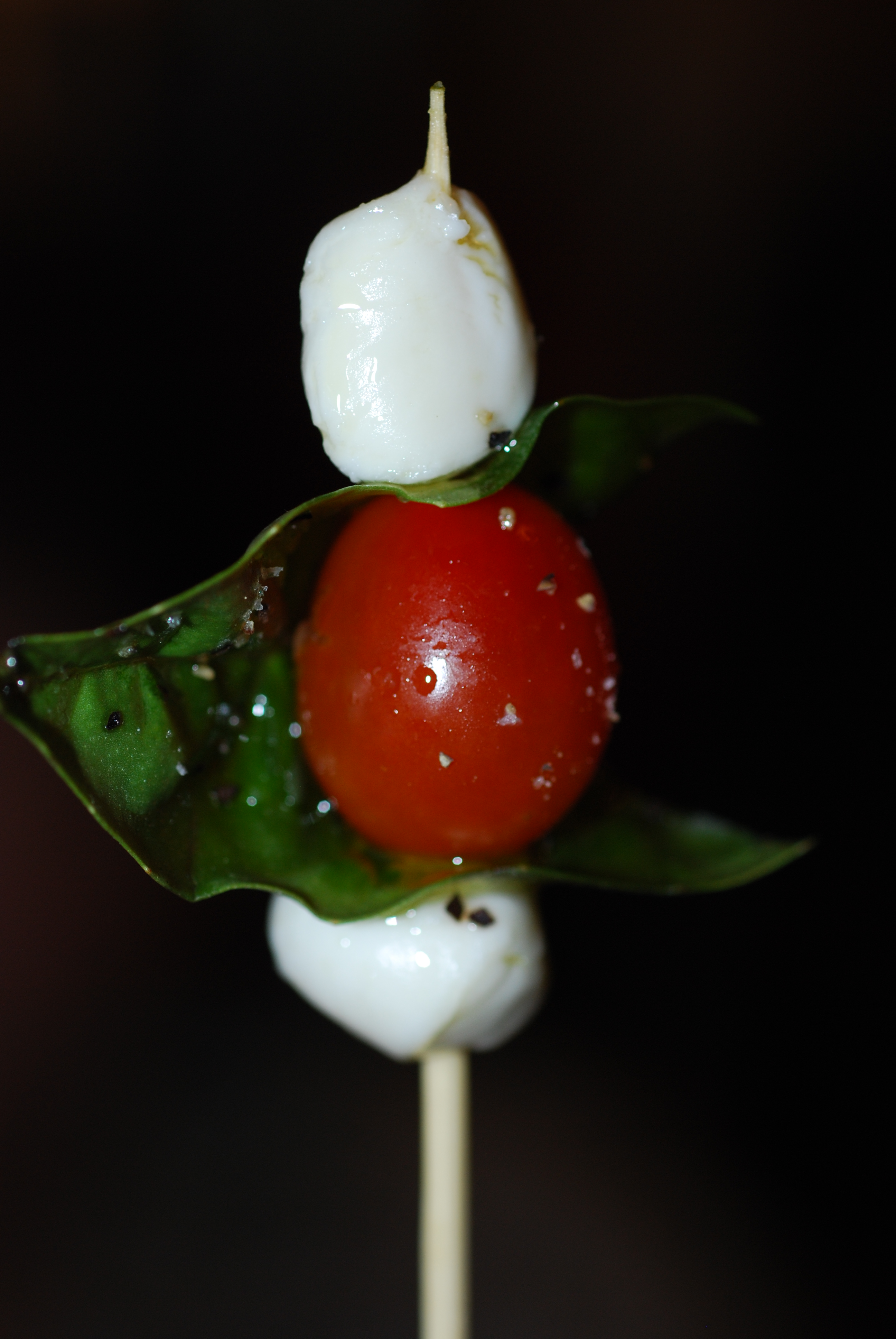 Take a skewer and stick one mozzarella ball, followed by a basil leaf (poke on one end of leaf, one tomato, the other end of the same basil leaf and a mozzarella ball. Lightly salt with sea salt. (See picture)