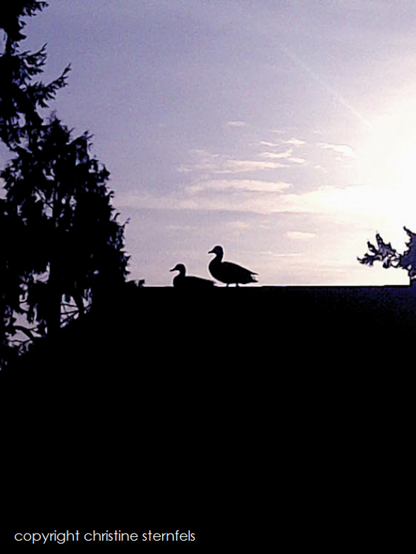 I can’t say the ducks are back, because for these guys… they hang out on our street all year.  Their favorite spot is my neighbor’s roof.  We walk past it to the bus stop every morning, so the kid decided to name them “Fiddler and his wife”.  I asked, “Why Fiddler?”  Her response “Because he’s always on the roof.”  And I asked “How do you know it’s a girl duck and boy duck, what if they’re both dudes?”  She proceeded to explain the distinguishing marks and corrected me by stating the male is called a drake and the female a hen.  So I asked one more question… “Why are they called ducks then?”  She said “If you need to know more, just google it mom.  Right now we have to get to the bus stop”.